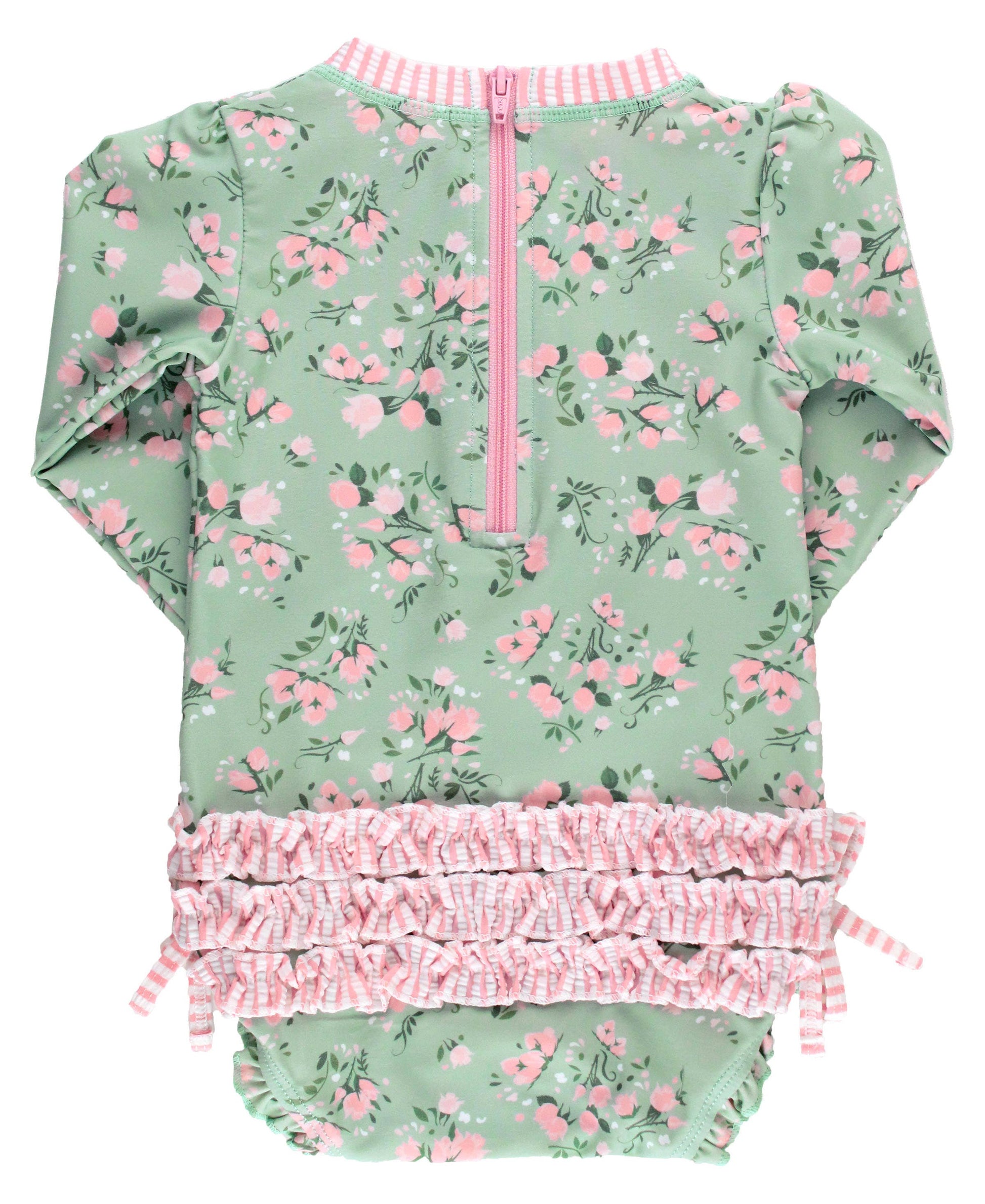 Tea Roses Long Sleeve One Piece Rash Guard Swimsuit with Signature Rear Ruffles