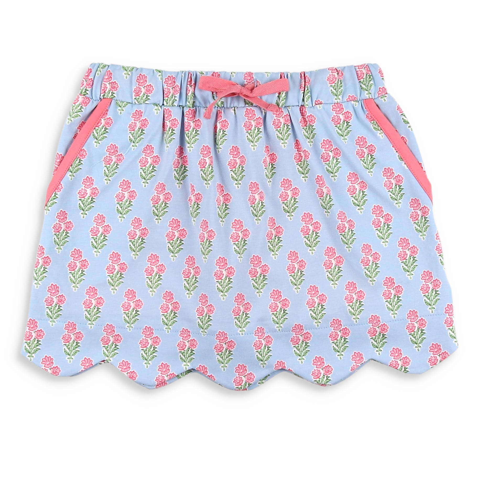 This adorable and whimsical skort features a coral floral bouquet print on periwinkle blue fabric with a sweet scalloped skirt, two coral trimmed side pockets, an elastic waist with a coral tie drawstring, and includes practical coral under shorts, all creating a precious and playful picture! Pair with our Coral Sunset Ruffle Top for an awesome look!