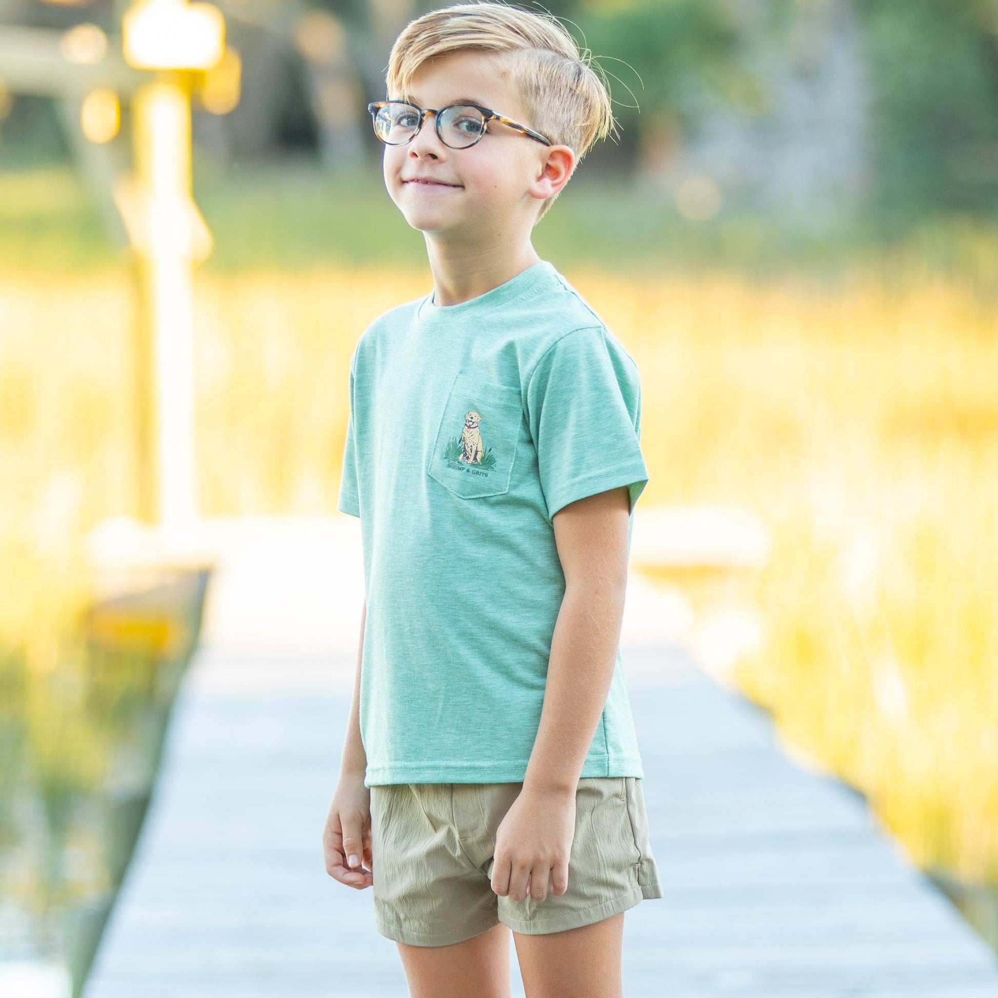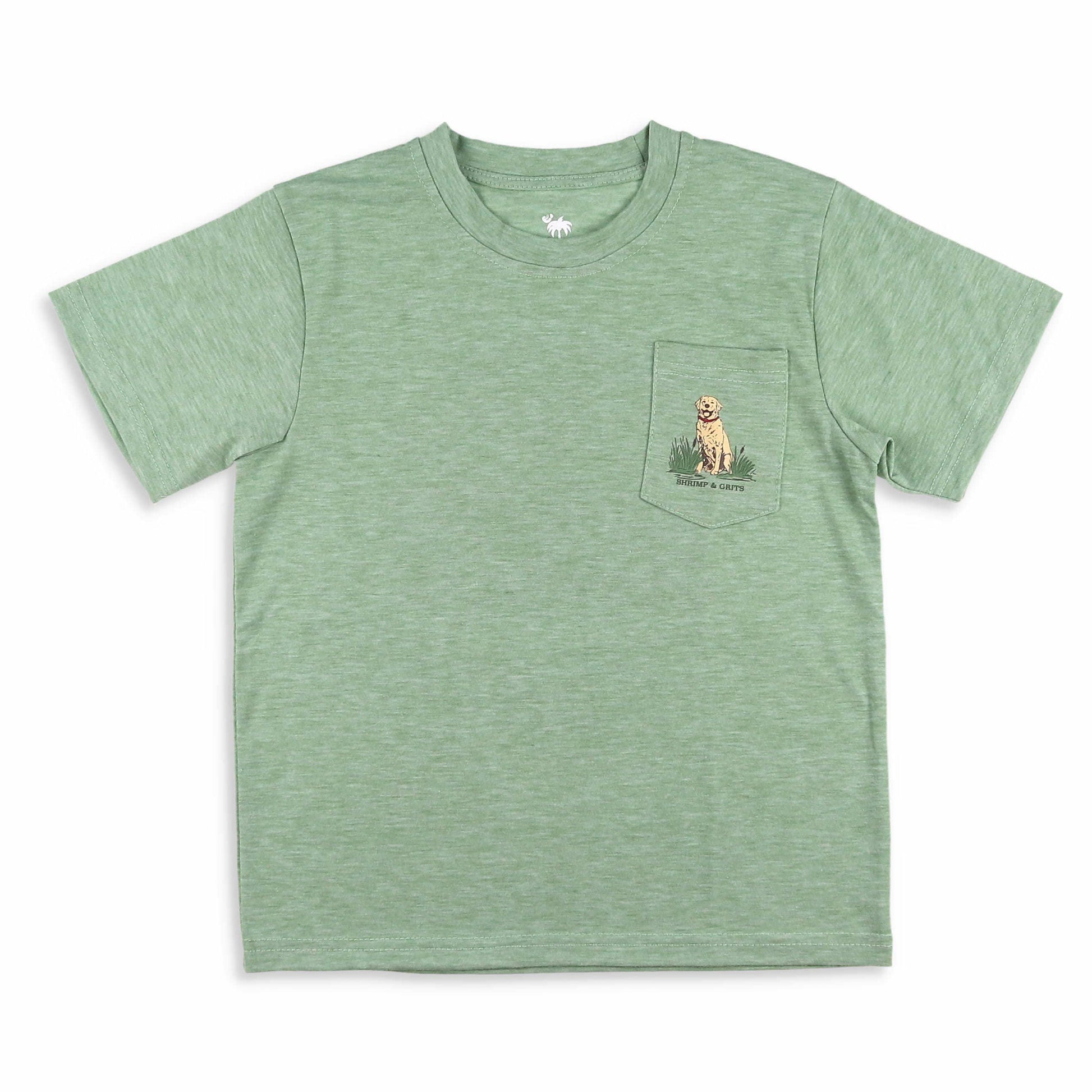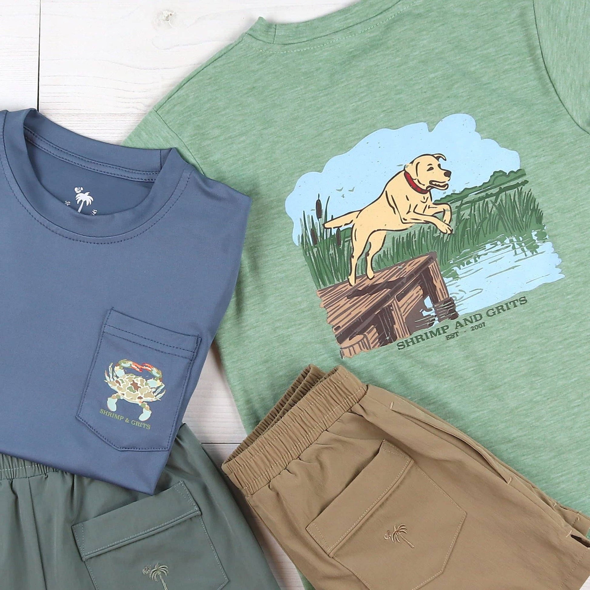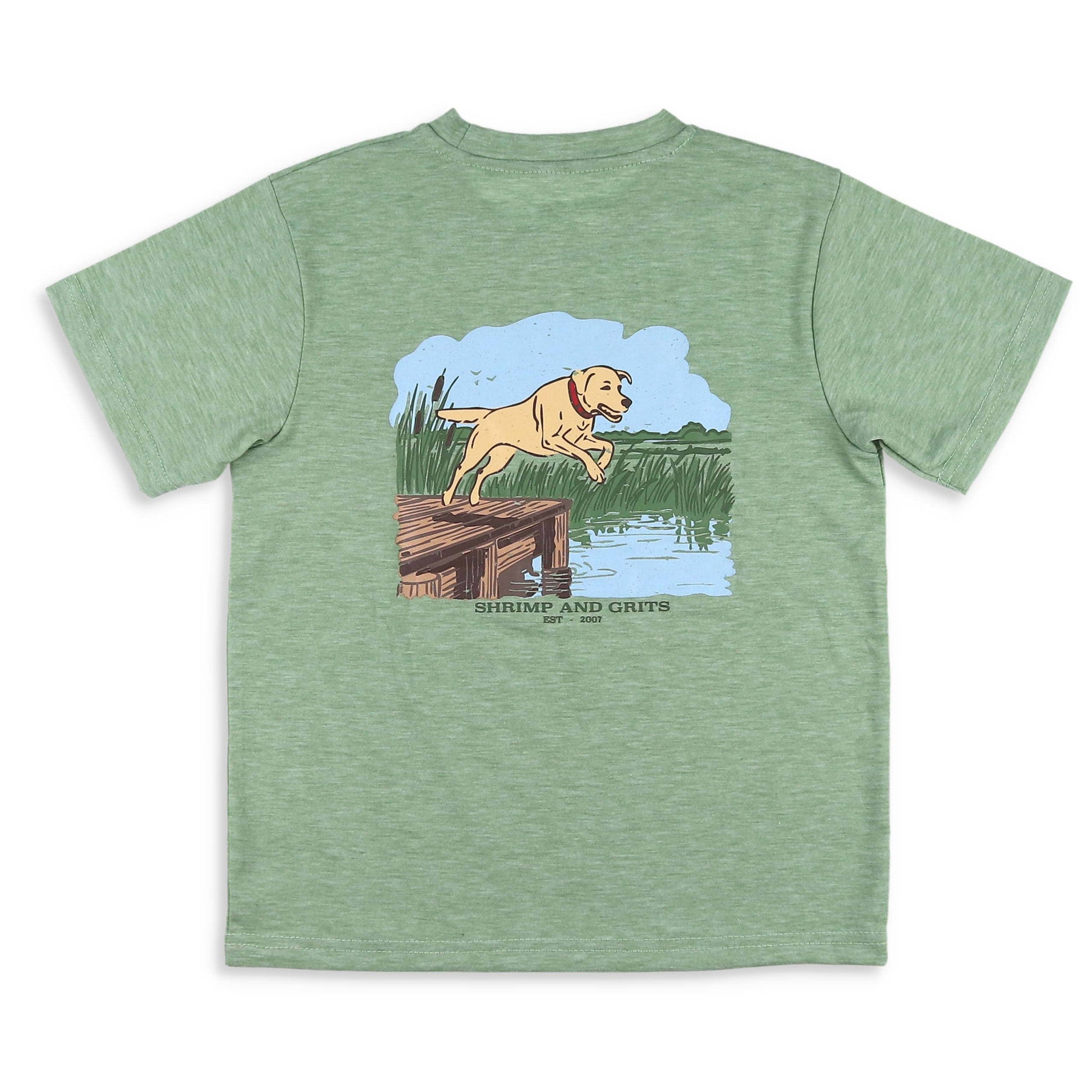 There's nothing like a water adventure with his pup! He'll have to have this boys Dock Days Graphic Tee by Shrimp and Grits Kids. Ready for a little swimming and oh so awesome! Featuring the versatile heathered green color, a graphic golden lab and the words Shrimp and Grits on its front pocket, and a larger graphic lab jumping off a dock with the words Shrimp and Grits and Est-2007 on the back. With this boys graphic tee your boys will be ready for their next swimming or boating adventure! It is so comfy and cute, this boys summer shirt can mix and match with his wardrobe, including so many of our Shrimp, Performance, or Knit Shorts. The perfect tee shirt for spring and summer fun.