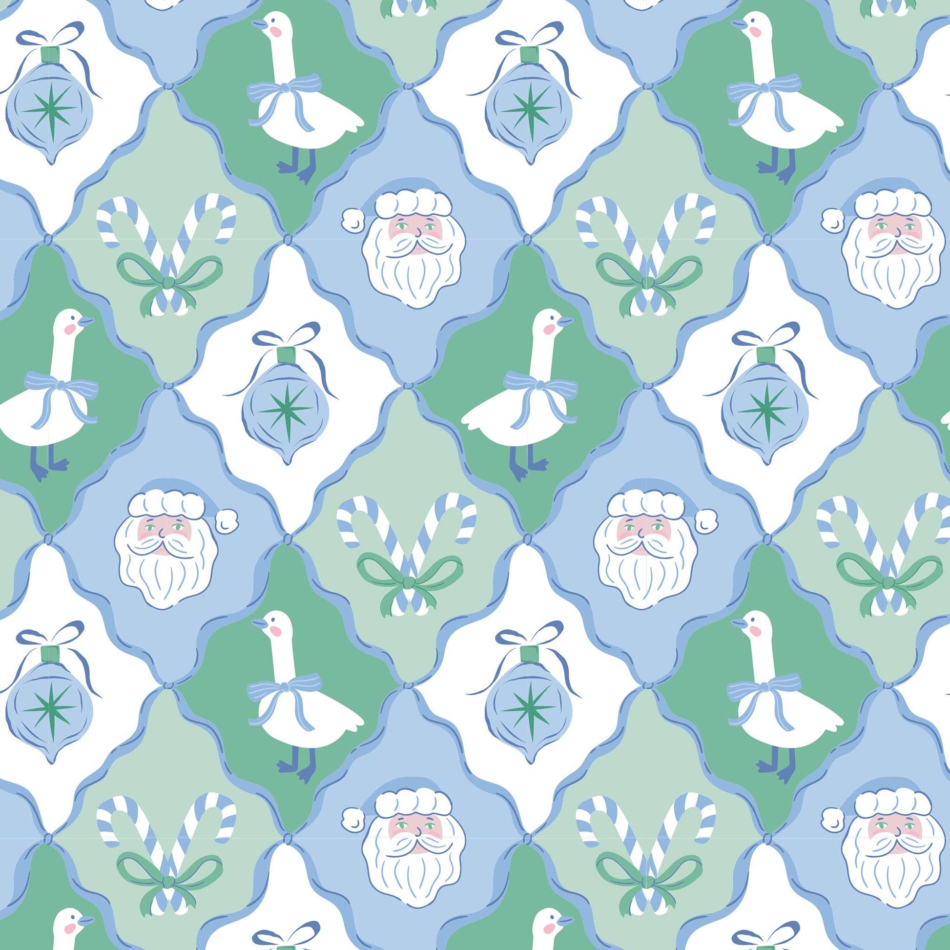 These adorable pajamas feature a vintage Santa, geese, candy canes, and ornaments in blue, white, and green printed on soft bamboo fabric. The blue banded neckline, the accent stitching, picot finished blue ruffle along the button tab, and the blue cuffs add classic and whimsical touches, while the elastic waist exudes comfort!