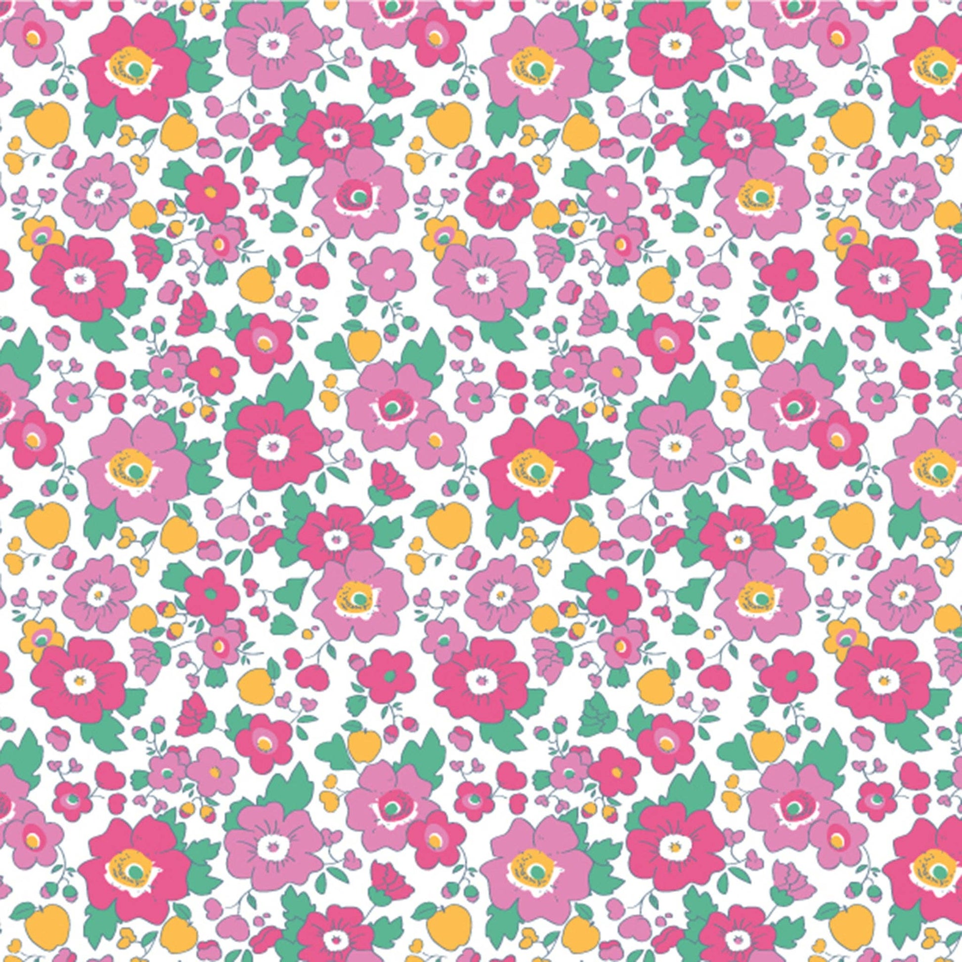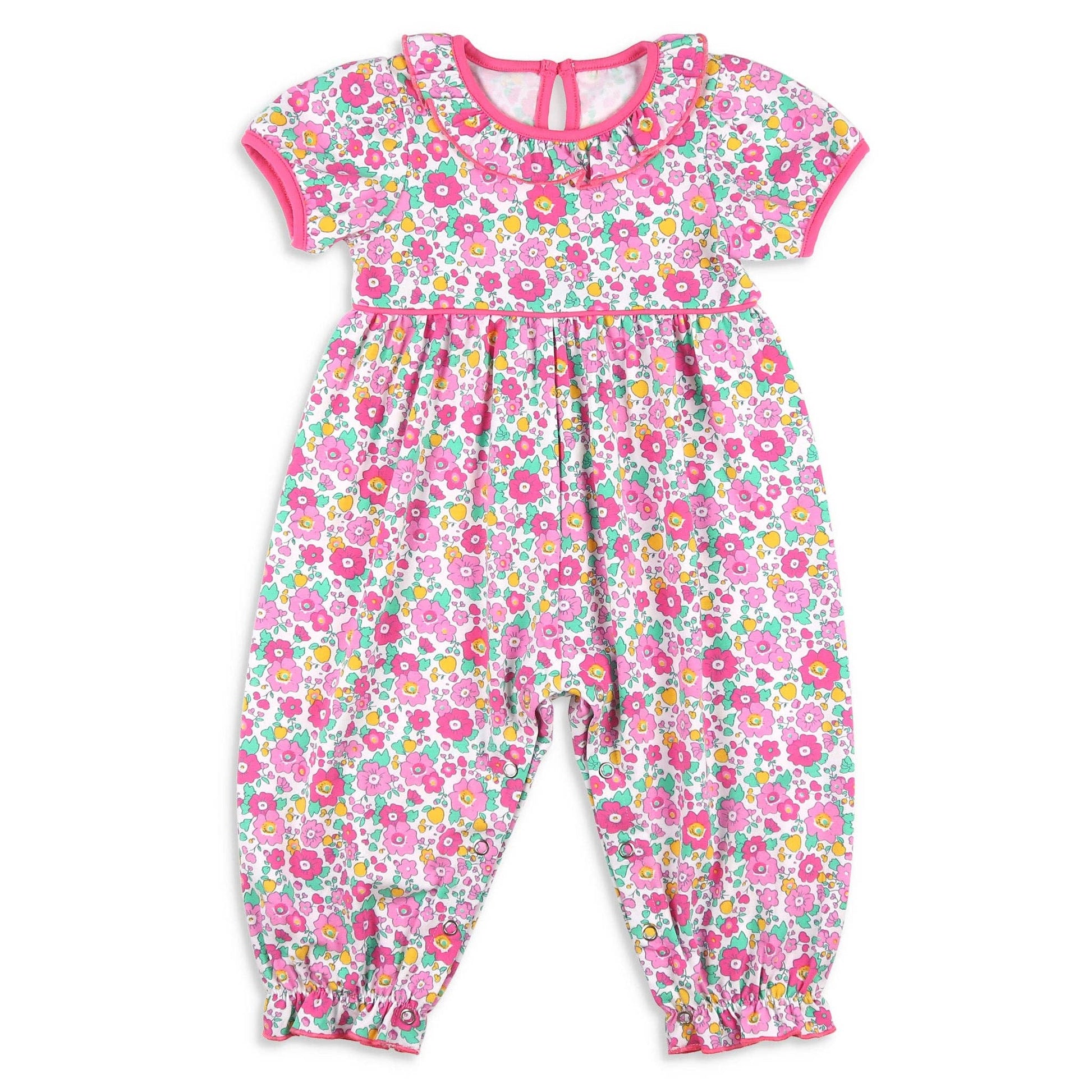 This sweet, feminine romper, features a soft fabric in a pink, green, raspberry, and yellow delicate floral and fruit print on white cotton knit, with raspberry pink serge trim along the ruffle collar and the leg ruffles, piping accent across the chest, and raspberry pink trim along the neckline, the short sleeves, and on the keyhole back, creating that special vintage look.