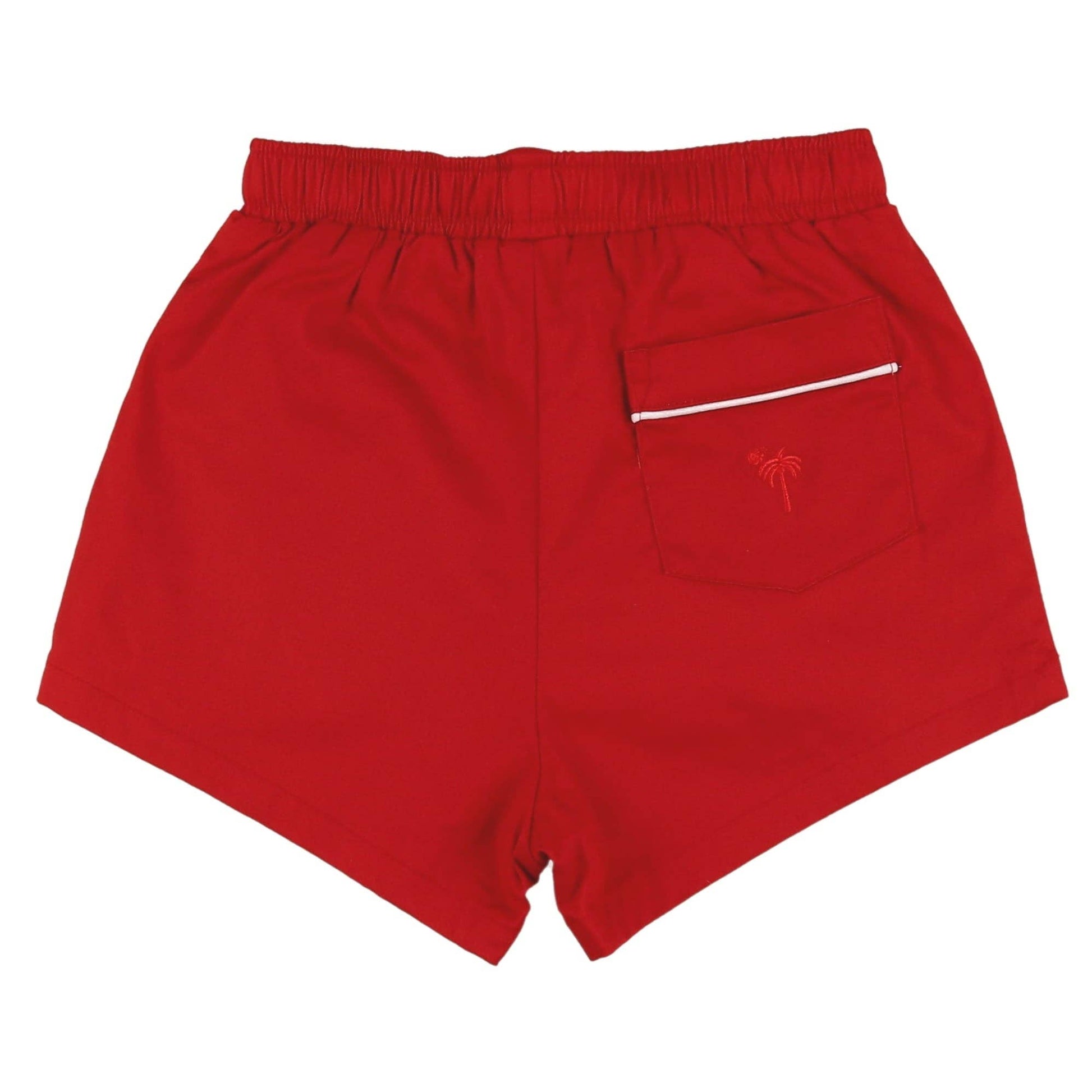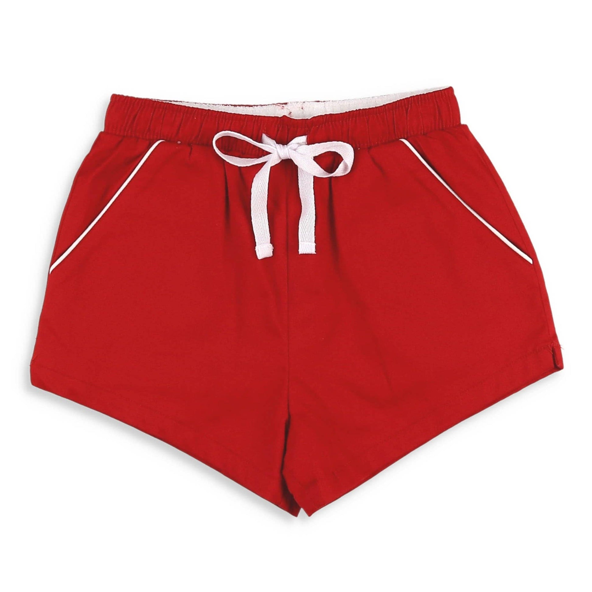 These classic boys shorts, or toddler boys shorts, feature a red cotton twill blend fabric, two white piping trimmed side pockets, a terry cloth lined elastic waist with a functional white drawstring, and a back pocket. Coordinates with so many of our collections and just about everything! Pair with many of our graphic tees, or any of his favorite T Shirts and have your fellow jumping at the chance to explore and play during these summer, and fall seasons. These also will be perfect for back to school! And for our warm climate friends, these could come in handy at the holidays!